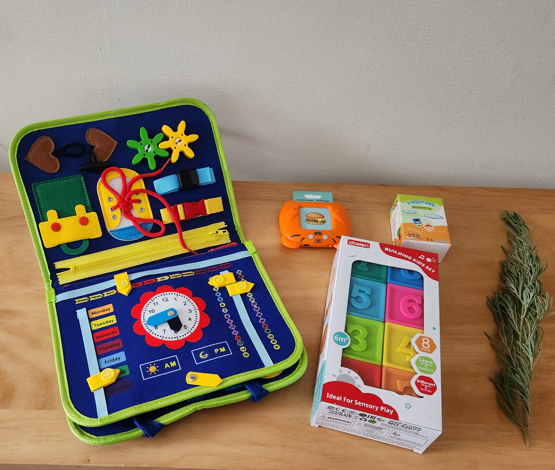 📔 Libro ocupacional: con actividades tipo “quiet book” que permiten abrochar, cerrar, contar y asociar, fortaleciendo la independencia y la motricidad fina.