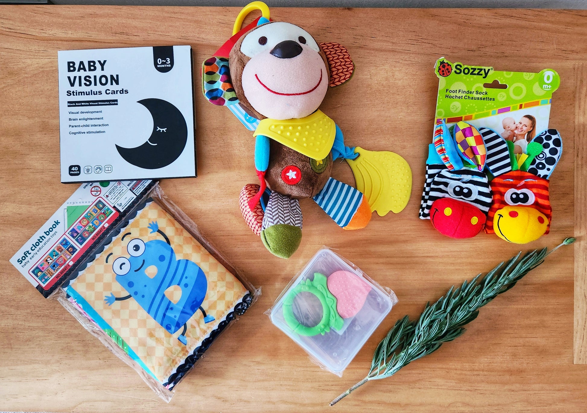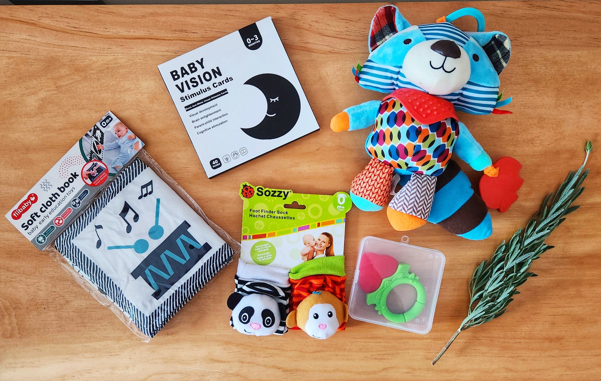 Ideal para regalar a recién nacidos o futuras mamás, contiene una selección de juguetes y recursos especialmente pensados para estimular la vista, el oído y el tacto desde los primeros días.